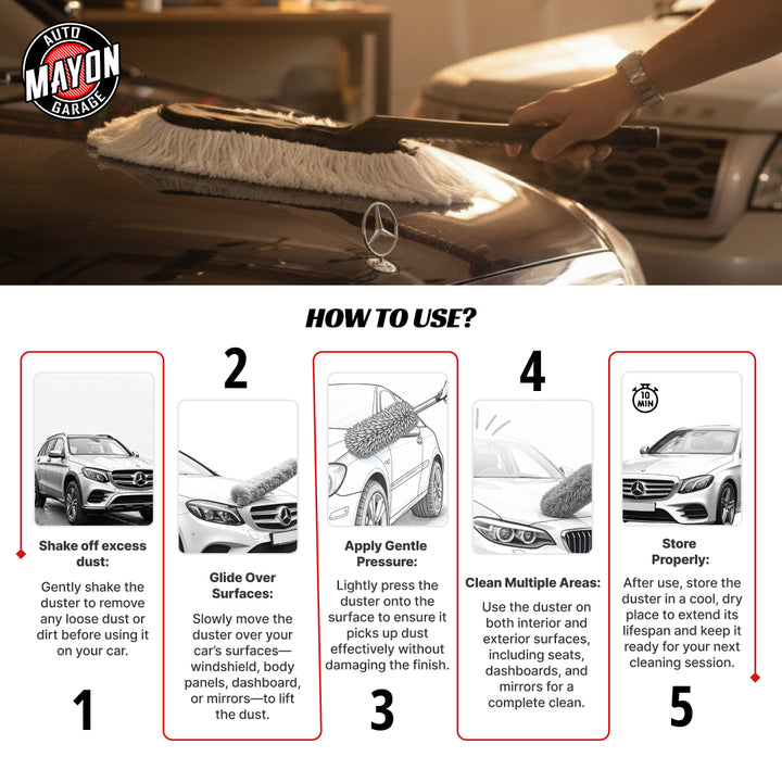 2.Gently glide the duster over your car’s surface, whether it’s the roof, windows, bumpers, or interior surfaces like your dashboard.