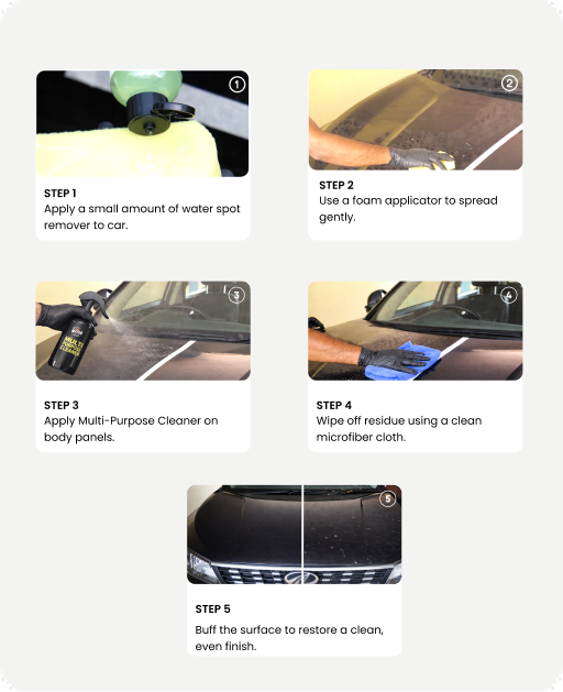 Hard water and borewell water contain high levels of minerals like calcium and magnesium. When water evaporates after washing, these minerals remain behind and form stubborn white spots on glass and paint surfaces. Regular shampoos and glass cleaners cannot remove these mineral deposits because they are chemically bonded to the surface. The Mayon Water Spot Removal Kit is specially formulated for Indian hard water conditions. It safely dissolves mineral buildup without aggressive rubbing or harsh acids. Designed as a surface-specific system, it restores clarity on glass and revives shine on paint through a safe DIY process