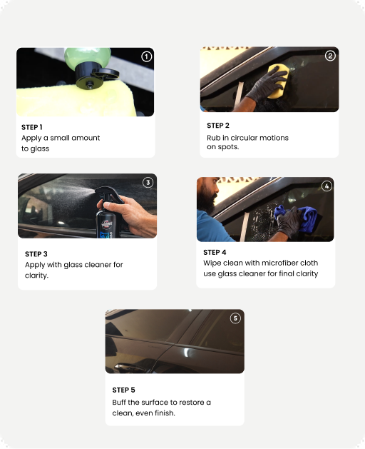 Perfectly removed very resistant hard water spots on all car surface types My new car got hard water spots all over one side of car and the windshield. I tired all methods like, waterless car wash, Colin, Lysol, etc. None of them worked to remove the spots even a little. I then ordered this product hesitantly and thought I’ll have to get polishing done for my car if this doesn’t work. But I just did a test run on glass, plastic headlight, car bonnet, painted plastics, etc. and this removed the spots at all places I tested! The only thing is, it needs a bit of careful scrubbing to remove the spots effectively, but works perfectly nevertheless