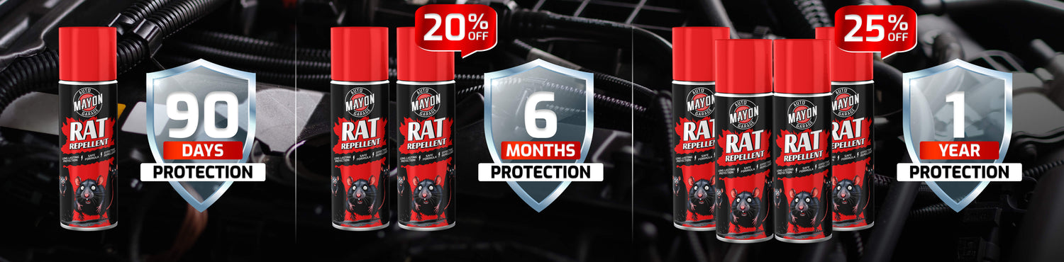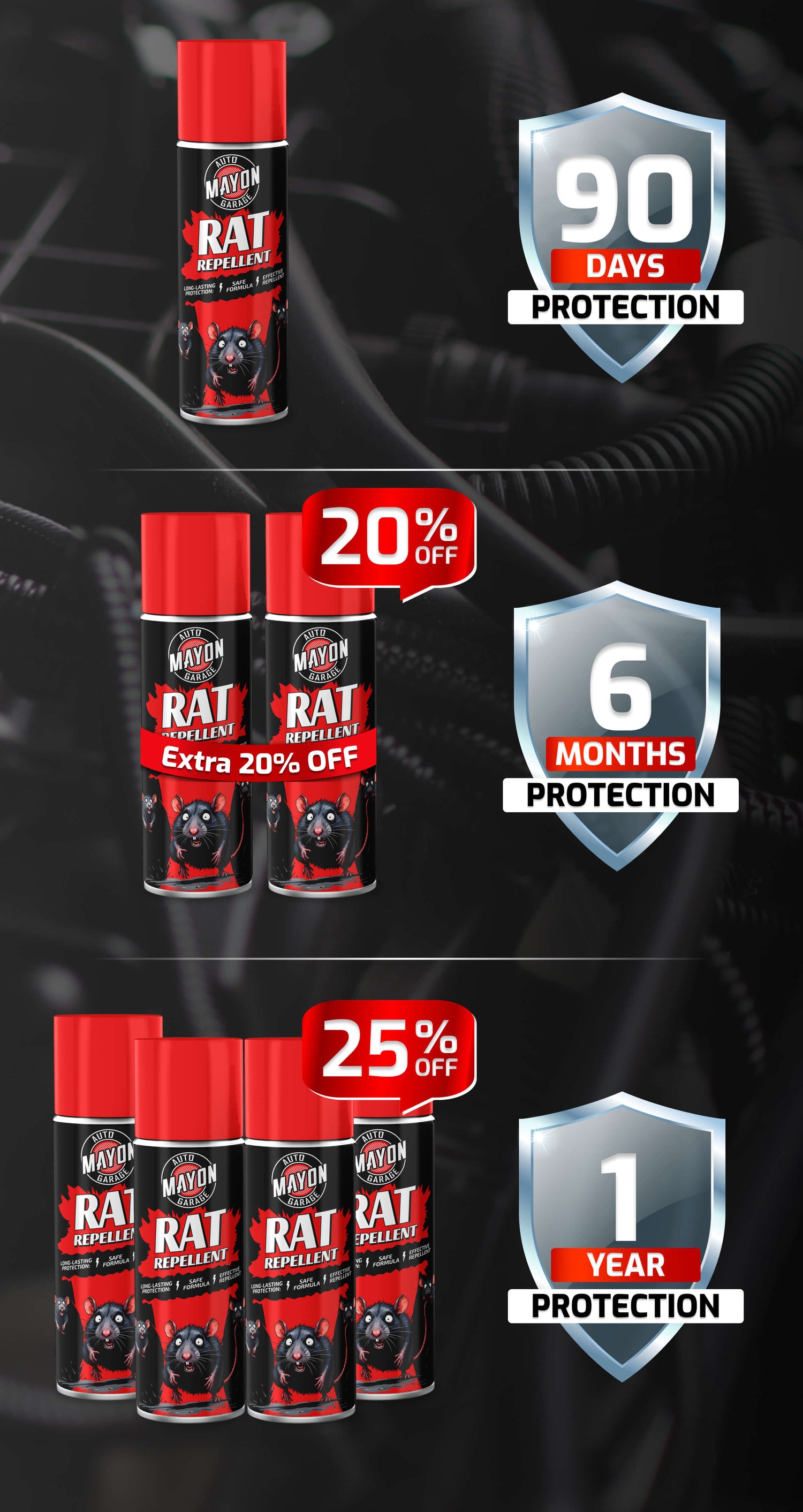 1. What is Mayon Auto Rat Repellent, and how does it work? Mayon Auto Rat Repellent is a specially formulated spray designed to deter rats and rodents from entering your car. Its unique odor is unpleasant to rodents but safe for humans. 2. How often should I use the product? Spraying frequency depends on the location and the intensity of rodent activity. For most cases, a full application every 60 days is sufficient. In high-intensity areas, reapply as needed for added protection. 3. Where should I apply the spray? Apply the spray across the engine compartment, wheel wells, and any areas prone to rodent entry. Avoid spraying directly on food or exposed electrical components. 4. Is it safe for my vehicle’s components? Yes, the product is designed to be safe for all vehicle components, including wiring, plastics, and paint. 5. Does the product leave stains or residues? No, Mayon Auto Rat Repellent dries quickly and does not leave any stains or residues when used as directed. 6. Can it be used in non-vehicle spaces? Yes, the spray is versatile and can be used in homes, garages, and storage areas to prevent rodent infestations. 7. Is the product eco-friendly and safe for children and pets? Yes, it is eco-friendly and safe to use around children and pets when applied as directed.